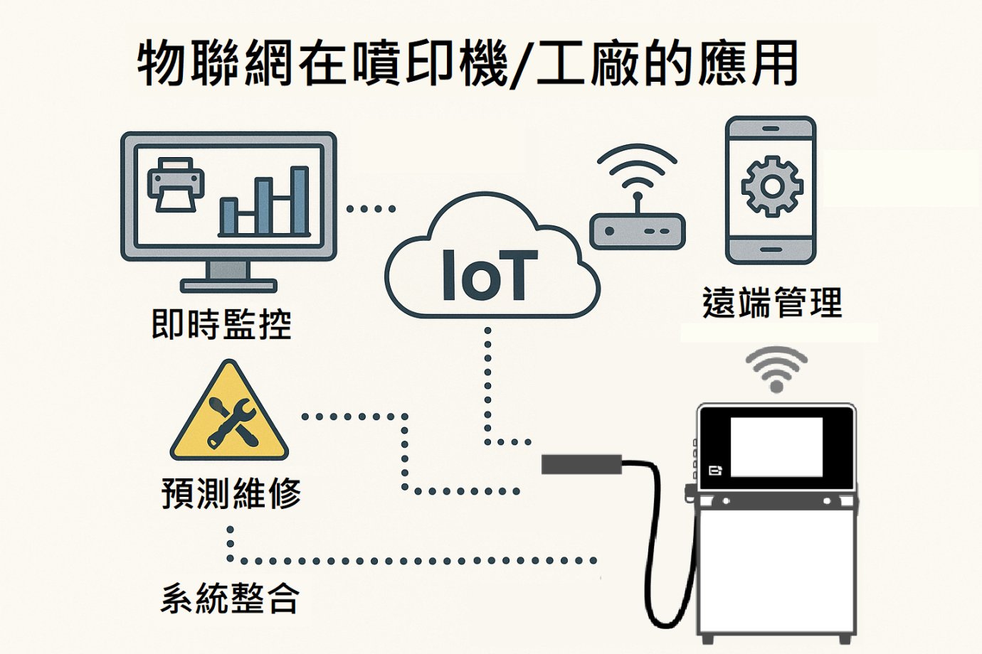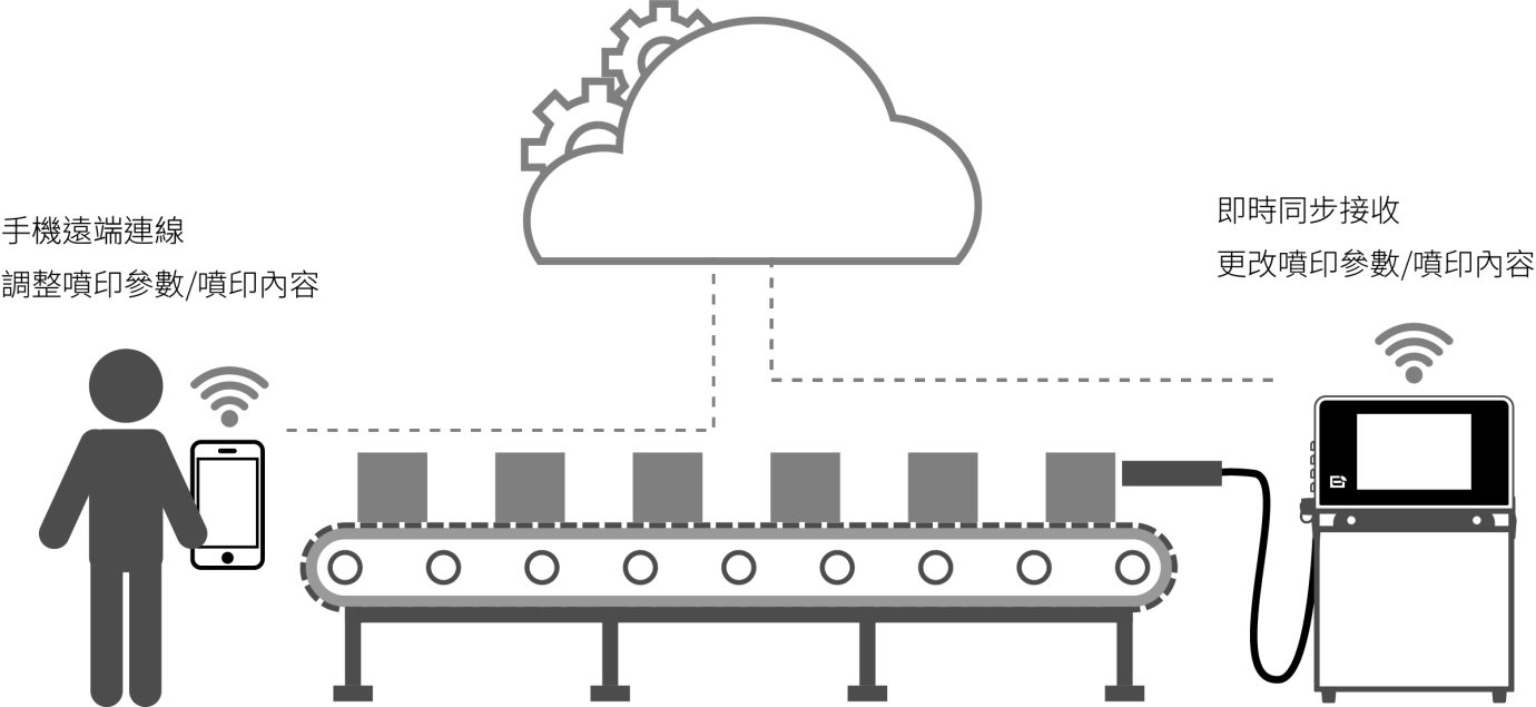 由遠端系統功能擴充 , 遠端無線傳輸 , 手機APP監控噴印數據 , 並通過安全的雲端服務 , 獲得遠端技術支援 。